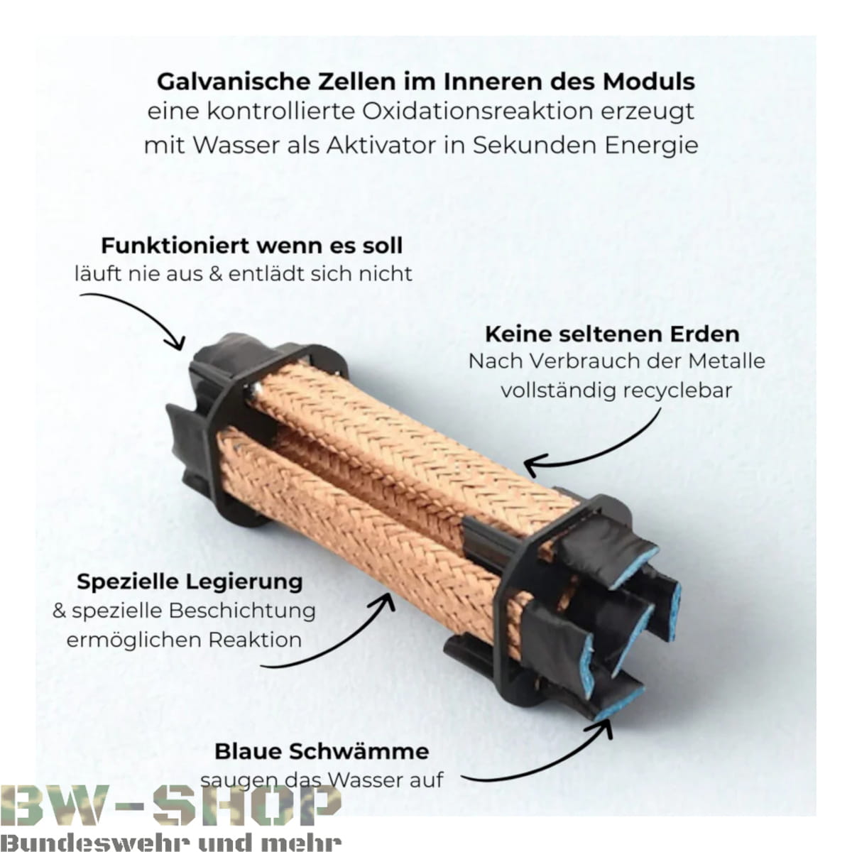 Eine Befeuchtung liefert mindestens 17 Stunden Licht, abhängig von Nutzung und Umgebungsbedingungen. Nach dem vollständigen Austrocknen ist die Taschenlampe erneut einsatzbereit und nahezu unbegrenzt lagerfähig, ohne Selbstentladung und ohne Wartungsaufwand. Sie eignet sich ideal für Notfallsets, Blackout-Vorsorge, Bushcraft-, Survival- und Campinganwendungen sowie für professionelle Sicherheits- und Einsatzbereiche. Mit einer Leuchtweite von bis zu 34 Metern sorgt die WaterLamp® Notfall-Taschenlampe zuverlässig für Orientierung und Sicherheit, wenn es drauf ankommt.