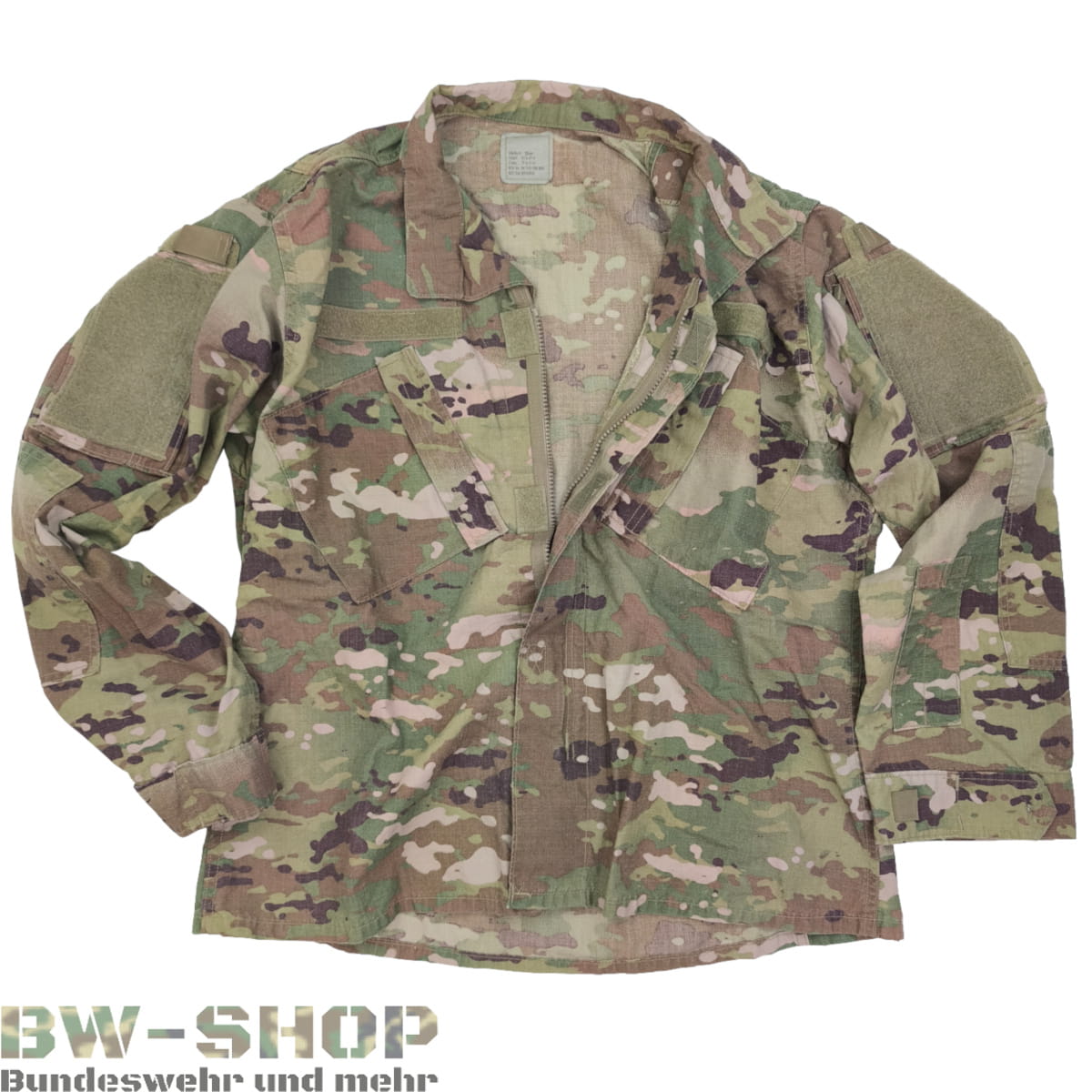 Original Kampfjacken der US Streitkräfte. Es handelt sich um die aktuelle Kampfbekleidung der US Army. Das neue Muster OCP Scorpion W2 ersetzt die bisherigen Farben und Muster ACU Digital und Multicam, aber bleibt trotzdem in einem Gewissen helleren Multicam Ton. Sowohl die Jacke als auch die Hose dieser neuen Uniform tarnt Sie nicht nur optimal in fast jedem Gebiet, sondern durch die vielen Taschen haben Sie eine Menge Platz für wichtige Dinge, die Sie immer am Mann tragen sollten. Mit einem sehr guten Tragekomfort und dem unverwüstlichen RipStop-Gewebe ist diese Jacke optimal für alle Einsätze geeignet.