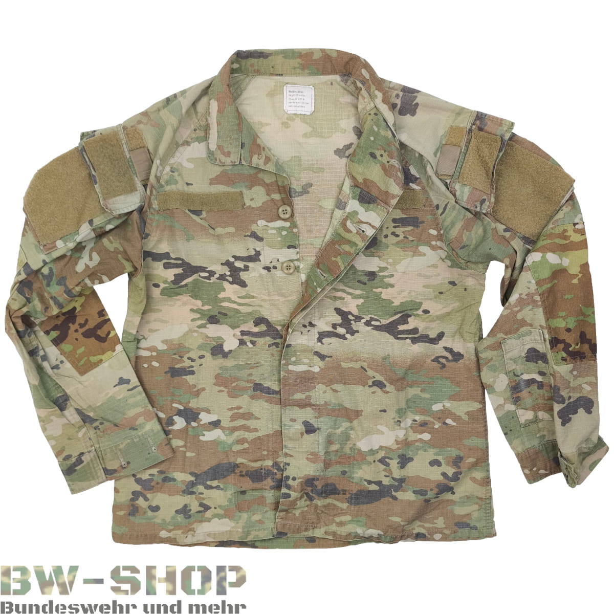 Original Kampfjacken der US Streitkräfte. Es handelt sich um die aktuelle Kampfbekleidung der US Army. Das neue Muster OCP Scorpion W2 ersetzt die bisherigen Farben und Muster ACU Digital und Multicam, aber bleibt trotzdem in einem Gewissen helleren Multicam Ton. Sowohl die Jacke als auch die Hose dieser neuen Uniform tarnt Sie nicht nur optimal in fast jedem Gebiet, sondern durch die vielen Taschen haben Sie eine Menge Platz für wichtige Dinge, die Sie immer am Mann tragen sollten. Mit einem sehr guten Tragekomfort und dem unverwüstlichen RipStop-Gewebe ist diese Jacke optimal für alle Einsätze geeignet.