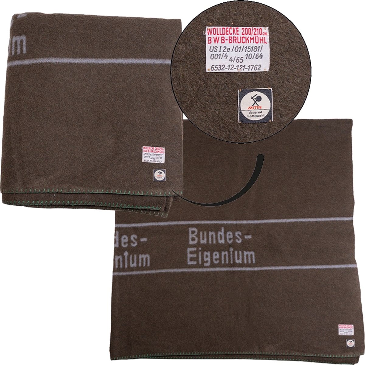 - Eingewebte Streifen mit Schriftzug "BUND" oder "BUNDESEIGENTUM" (keine Auswahl des Schriftzuges möglich)