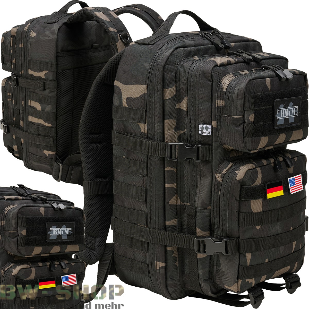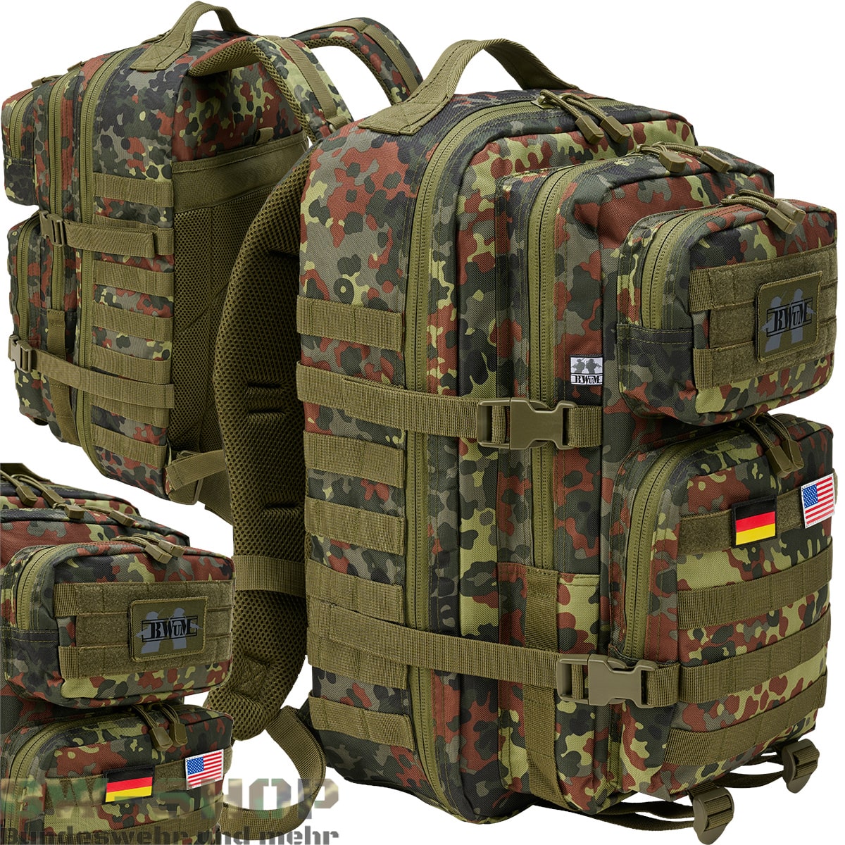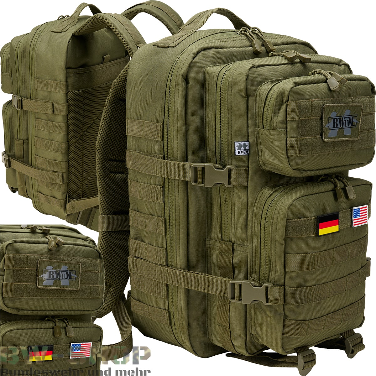 Nun können Ihre Outdoor Aktivitäten so richtig starten! Der Assault Pack der US Army ist ein funktioneller Rucksack, der zu allen Lebenslagen passt und bei jedermann bekannt ist. Das wählbare und geräumige Volumen mit 30L, 50L oder 70L trifft auf gute und robuste Qualität. Hinzu kommen viele Taschen und Befestigungsmöglichkeiten für Ausrüstung. Da solch ein Rucksack ein Muss für jeden Outdoor Liebhaber ist und auf keiner Survival Tour fehlen darf, haben wir den beliebten Assault Pack oder auch Cooper genannt, nun auch zu unserer Eigenmarke aufgenommen und produzieren lassen. Er wurde von uns überarbeitet und noch reißfester und robuster mit unseren Qualitätsangaben hergestellt. Dieser Assault Cooper besitzt nun einen verstellbaren Brustgurt und robustere Reverse-Reißverschlüsse. Außerdem haben wir durch zusätzliche Polsterung ein noch angenehmeres Tragegefühl geschaffen, damit auch bei hoher Last der Rucksack optimal getragen werden kann. Hinzu kommen die klettbaren Flaggen der USA und Deutschland und unser Logo Patch, die Sie variabel verwenden können oder Ihre eigenen Patches, Namensschilder oder andere Abzeichen problemlos durch Klett anbringen können. Hier erhalten Sie einen perfekten Rucksack für viele Zwecke unserer Eigenmarke BWuM (Bundeswehr-und-Mehr). Unsere Marke steht für Qualität, die Sie sicher nicht enttäuschen wird. Wir bieten Ihnen zu einem fairen Preis die bestmöglichen Produkte aus eigener Entwicklung.