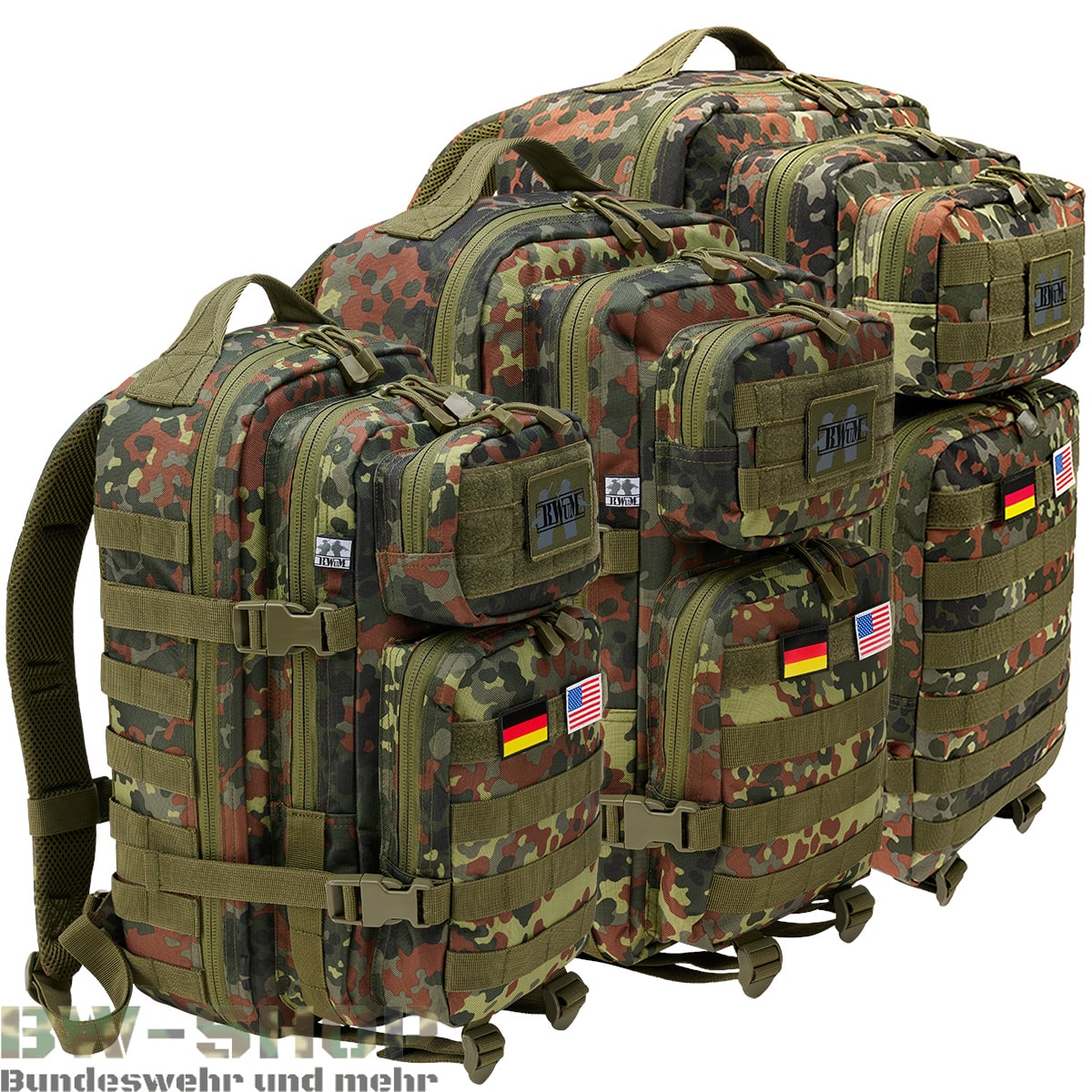 Nun können Ihre Outdoor Aktivitäten so richtig starten! Der Assault Pack der US Army ist ein funktioneller Rucksack, der zu allen Lebenslagen passt und bei jedermann bekannt ist. Das wählbare und geräumige Volumen mit 30L, 50L oder 70L trifft auf gute und robuste Qualität. Hinzu kommen viele Taschen und Befestigungsmöglichkeiten für Ausrüstung. Da solch ein Rucksack ein Muss für jeden Outdoor Liebhaber ist und auf keiner Survival Tour fehlen darf, haben wir den beliebten Assault Pack oder auch Cooper genannt, nun auch zu unserer Eigenmarke aufgenommen und produzieren lassen. Er wurde von uns überarbeitet und noch reißfester und robuster mit unseren Qualitätsangaben hergestellt. Dieser Assault Cooper besitzt nun einen verstellbaren Brustgurt und robustere Reverse-Reißverschlüsse. Außerdem haben wir durch zusätzliche Polsterung ein noch angenehmeres Tragegefühl geschaffen, damit auch bei hoher Last der Rucksack optimal getragen werden kann. Hinzu kommen die klettbaren Flaggen der USA und Deutschland und unser Logo Patch, die Sie variabel verwenden können oder Ihre eigenen Patches, Namensschilder oder andere Abzeichen problemlos durch Klett anbringen können. Hier erhalten Sie einen perfekten Rucksack für viele Zwecke unserer Eigenmarke BWuM (Bundeswehr-und-Mehr). Unsere Marke steht für Qualität, die Sie sicher nicht enttäuschen wird. Wir bieten Ihnen zu einem fairen Preis die bestmöglichen Produkte aus eigener Entwicklung.