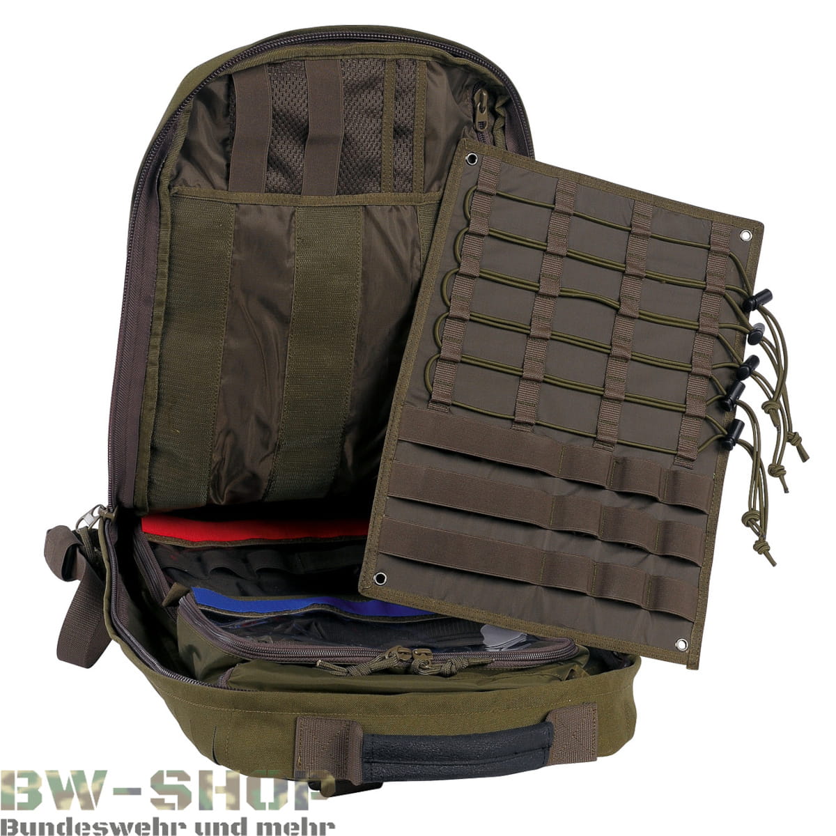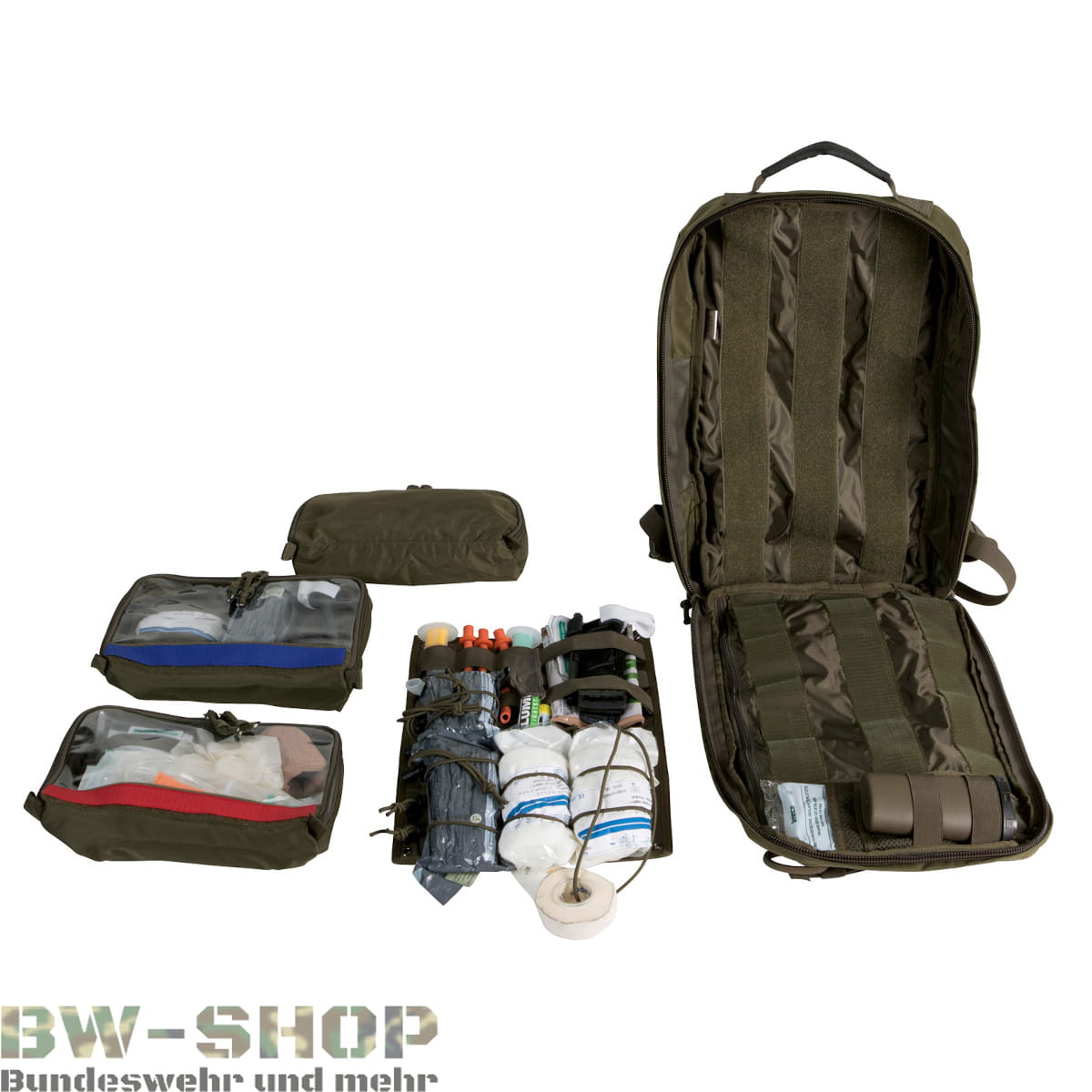 Flacher Medic-Rucksack mit intelligenter, übersichtlicher Innenaufteilung. Das MOLLE-System auf der Front und an den Seiten ist in Lasercut-Technik ausgeführt.