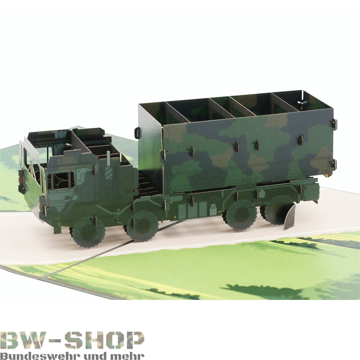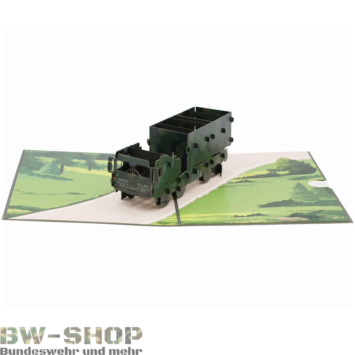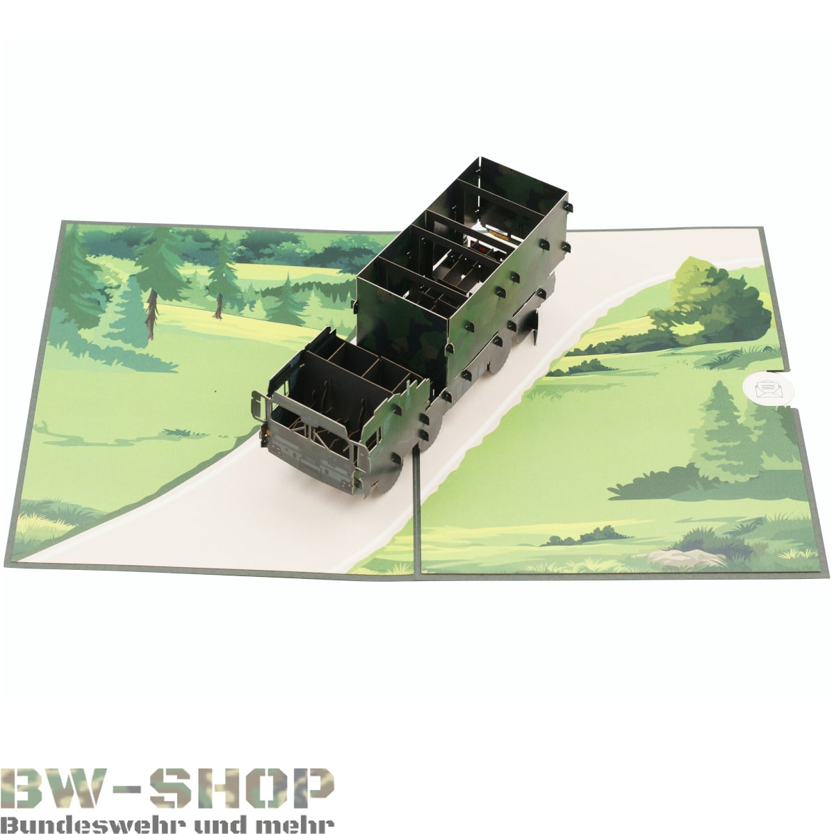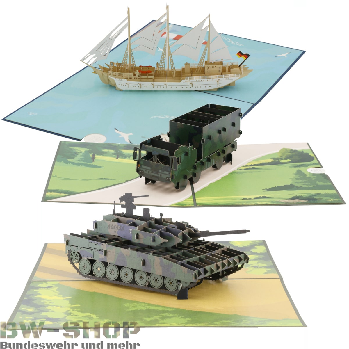 Überrasche mit unseren handgefertigten Pop-Up Karten! Perfekt als Geburtstagskarte für Soldaten oder als Gutschein. Beim Öffnen entfaltet sich je nach Auswahl ein detailreicher 3D-Panzer, ein 3D-Transportfahrzeug oder eine 3D-Gorch Fock, die garantiert Staunen auslösen. Ein einzigartiges Geschenk für Militärbegeisterte.