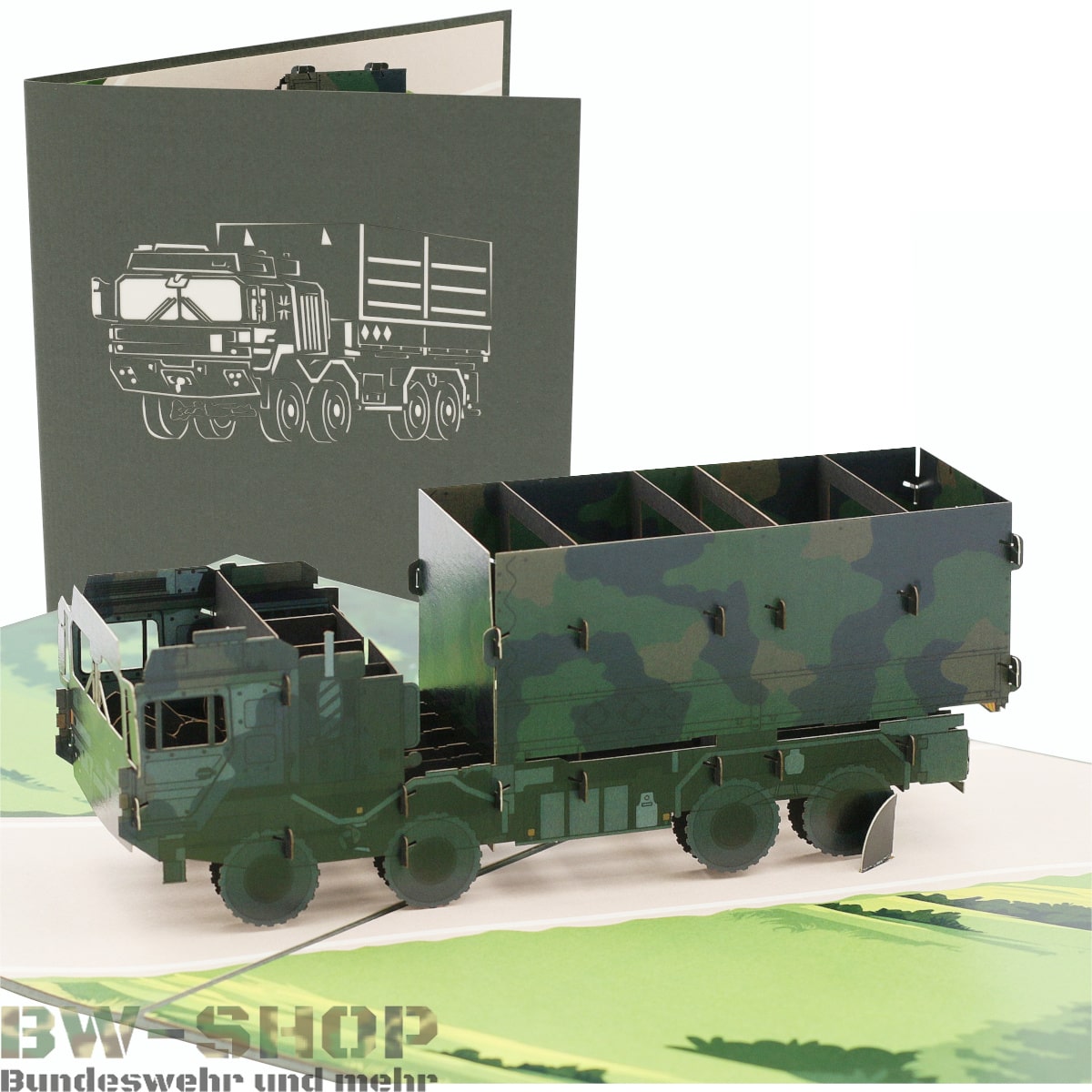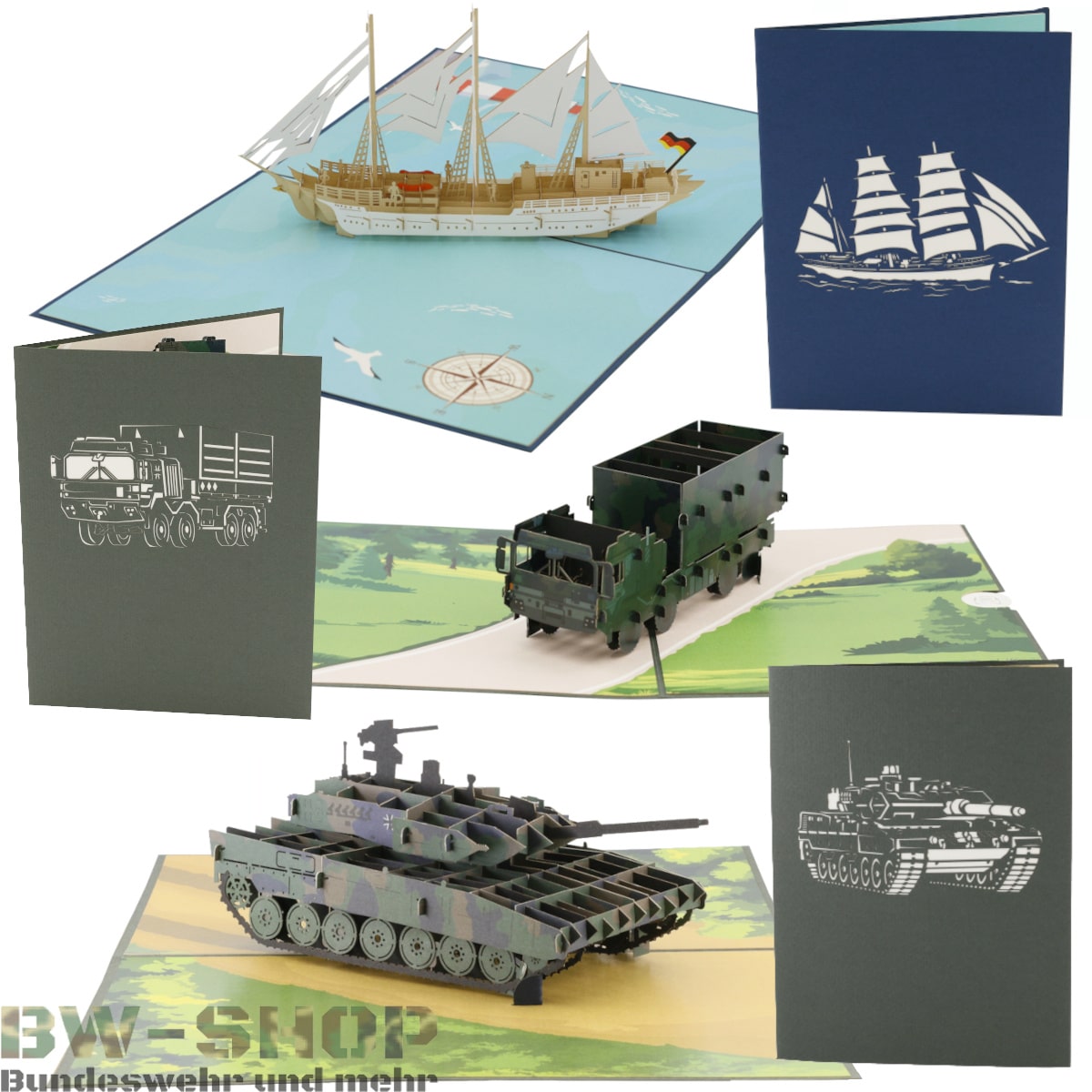 Überrasche mit unseren handgefertigten Pop-Up Karten! Perfekt als Geburtstagskarte für Soldaten oder als Gutschein. Beim Öffnen entfaltet sich je nach Auswahl ein detailreicher 3D-Panzer, ein 3D-Transportfahrzeug oder eine 3D-Gorch Fock, die garantiert Staunen auslösen. Ein einzigartiges Geschenk für Militärbegeisterte.